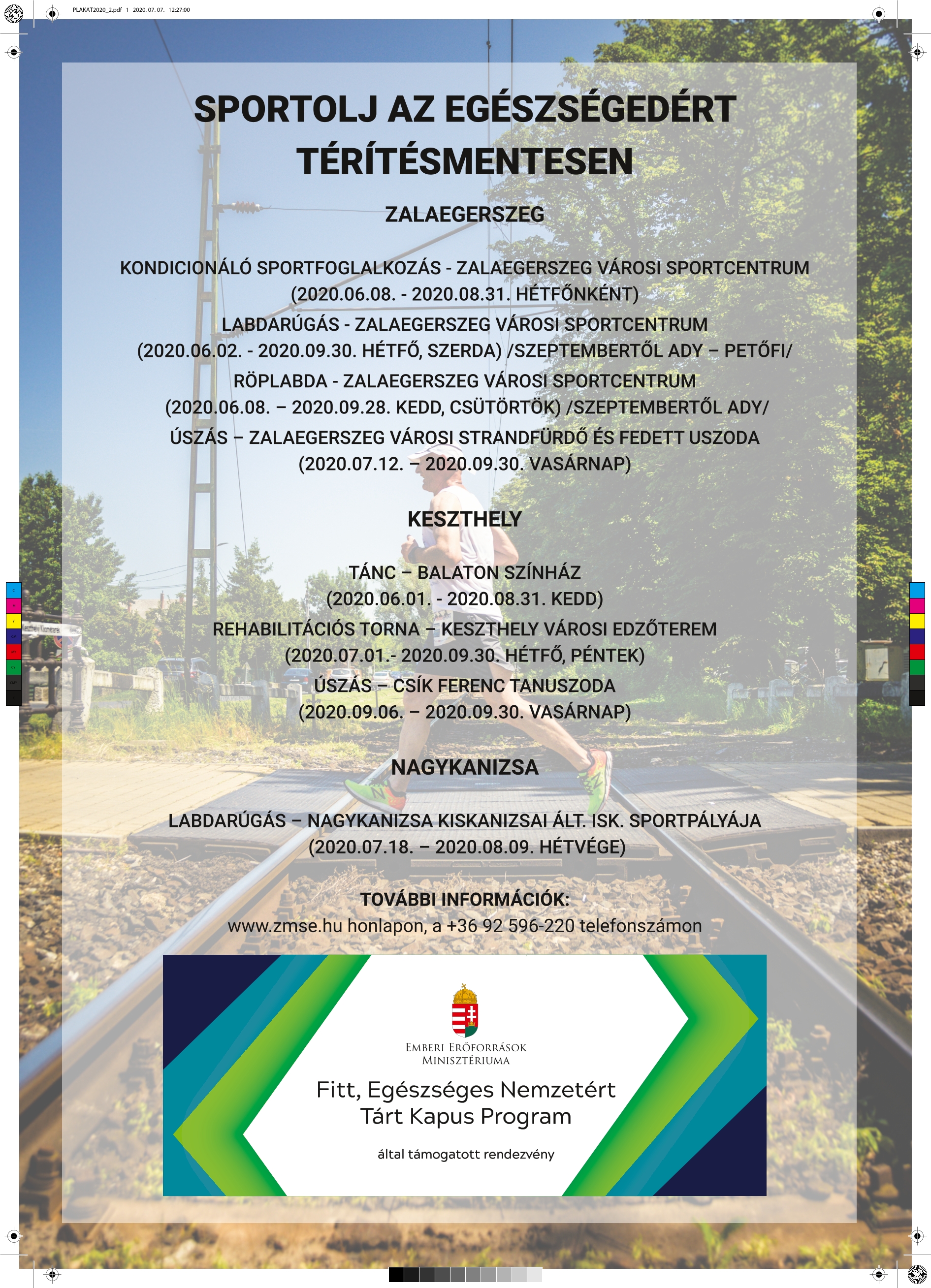 Fitt, Egészséges Nemzetért Tárt Kapus Program keretében a Zala Megyei Szabadidősport Szövetség pályázati támogatásból a Zalaegerszegi Létesítményfenntartó Kft-vel együttműködve térítésmentesen biztosítja a Fedett Uszoda használatát 2020. július 12. és 2020. szeptember 27. között minden vasárnap 14 órától 19 óráig.