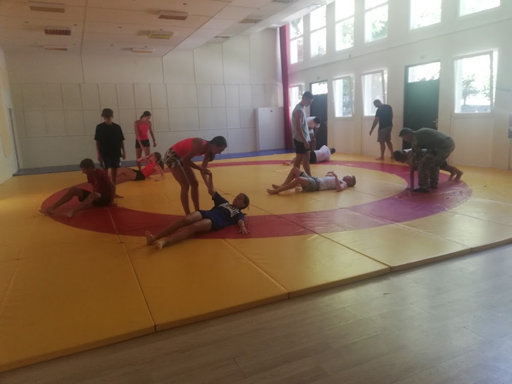 Hétfőn reggeli futással kezdtük a napot, kb. 3 km volt a táv. Befag Keszthelyi Erdész Lövészklub vezetőjét Keczeli Zoltán urat és segítőit fogadtuk a táborban. Légpuskával, távcsövessel is és légpisztollyal tanította lőni a diákokat a neves edző. Nagy sikere volt a gyakorlásnak, élvezték a gyerekek fogyott a lőszer rendesen. Délután következett a Zalaegerszegi Judo Sportegyesület elnöke, edzője Varga Zoltán úr, aki az önvédelemről először szóban beszélt, majd következett a gyakorlat. A különböző tompítások, gurulások, kisebb horgok, dobások variációja is felkeltette a résztvevők érdeklődését. Az intenzív gyakorlás után rövid pihenő, majd a sportpályán folytattuk a napi „kiképzést”. Közös gimnasztika, törzserősítés, plankok gyakorlása majd, általános erősítés következett. Nem kellett mesélni a diákoknak az elalvás előtt.